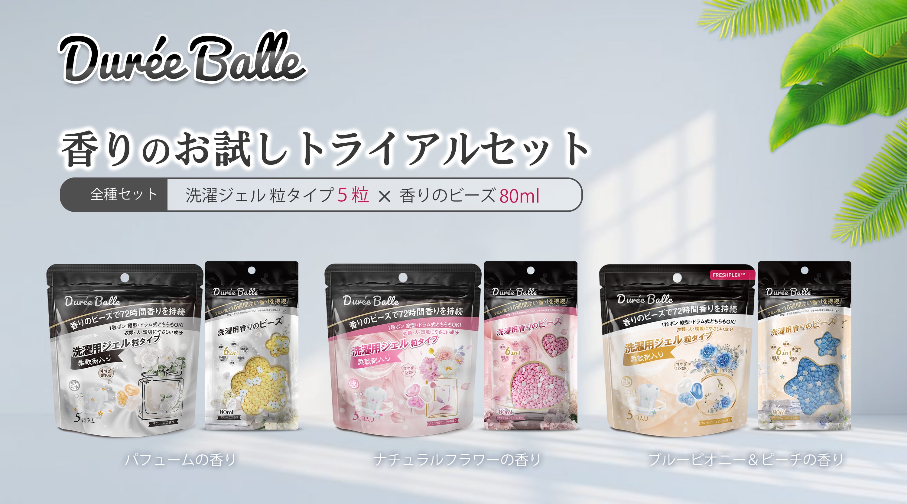 デュリボール 洗濯用ジェル粒タイプ&香りのビーズ 全6種類セット ・香りって人それぞれ好みは違う。 ・大きいサイズを買う前に香りを試してみたい。 お客様の声から生まれた特別なスターターセットが発売開始。 パフュームの香り ナチュラルフラワーの香り ブルーピオニー & ピーチの香り 日常の洗濯にちょっとした贅沢を。 手軽に贅沢な香りと清潔感を楽しめる、新しい洗濯習慣を始めてみませんか? 心地よい香りで生活空間を彩るデュリボールの香りビーズを、ぜひご体験ください。 【洗濯用ジェル粒タイプ】 香りビーズ配合で、洗浄力と香りをひと粒で贅沢に。 衣類をしっかり洗い上げながら、上品で華やかな香りを長時間キープします。 柔軟剤成分も配合され、ふんわりとした肌ざわりに。 使い方と対応機種 使い方は簡単です。1粒を洗濯機にポンと入れるだけ。 洗剤・柔軟剤・香りづけの3役をこなすオールインワンタイプです。 縦型・ドラム式どちらの洗濯機にも対応し、お試し用5個入りのパウチタイプでお気に入りの香りを選んでください。 長期間の旅行や出張などにも便利です。 【香りのビーズ】 デュリボール香り付け専用ビーズは、洗濯物に高級感あふれる香りをプラスするためのフレグランスビーズです。 香りのお試しサイズや、トラベルサイズとしても便利な80mlのコンパクトなパウチで、使用量を自由に調節でき、お好みの香りの強さでお楽しみいただけます。 パフュームの香りは、衣類にエレガントで華やかな香りをまとわせ、洗濯物を特別な仕上がりへ導きます。 ナチュラルフラワーの香りは、自然でやさしい香りが特長で、衣類を爽やかに仕上げます。 ブルーピオニー&ピーチの香りは、ブルーローズとジャスミンの上品な香りが広がり、特別な香りと柔らかさをプラスします。 この香り専用ビーズは、洗剤や柔軟剤と一緒に洗濯機へ入れるだけで、最長16週間香りが持続します(※香りの持続期間は、衣類の素材、着用頻度、天候、湿度・温度などの保管環境によって変動します)。 さらに、柔軟効果・消臭・静電気防止・吸水力アップ・速乾性アップ・芳香の、6つの機能を1つにまとめた洗濯用フレグランスです。