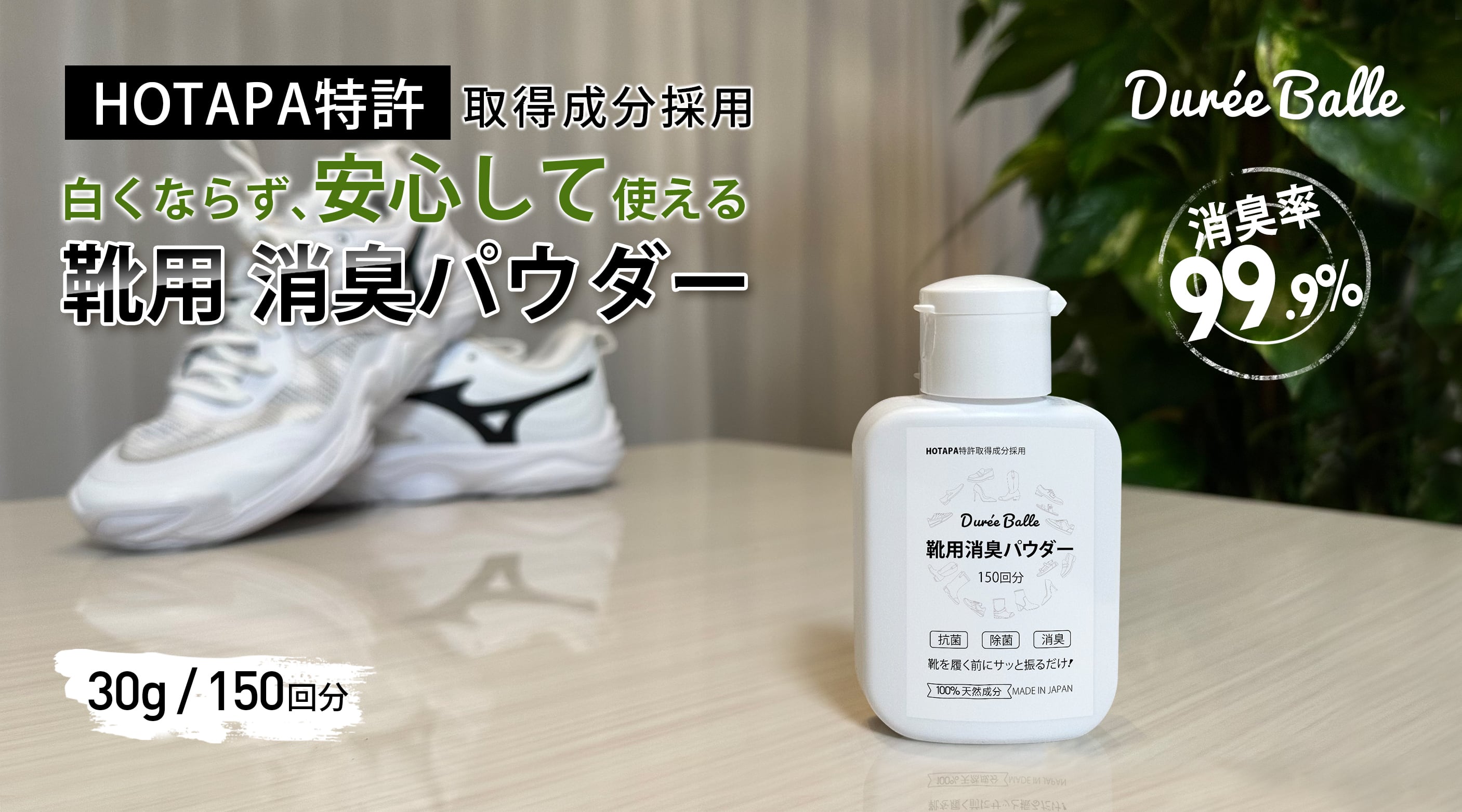 HOTAPA特許成分採用!白くならず、安心して使える。 テュリボール ブランドの靴用 消臭パウダー。 靴を脱いだときのニオイ・玄関の悪臭について、こんなお悩みありませんか? ・足裏にたくさん汗をかいてしまう ・洗うことができない靴やブーツの匂いが気になる ・消臭パウダーすると白く粉が残る ・お肌に安心なのかわからない 靴の消臭を「使うたび」ではなく、「履く前に準備する」新しいスタイル。 \ 使用前にパウダーをサッと振り掛けるだけ / HOTAPA特許取得成分採用 ・白く残らない ・濃度が高い ・経済的 一般的な焼成カルシウムは水100mlに対して、0.17gしか溶けないので白く残る可能性があります。 開発した特許取得の可溶性焼成カルシウムは水100mlに1g溶けます。 なので、白く残らない・濃度が濃く効果も高いことが立証されています。 濃度が濃いので1回の使用料も少ないのが特徴です。 自信を持ってオススメできるのは、第三者試験で実証済だからです。 【防カビ対策】 ・大切な靴をカビからしっかり守る シューズクローゼットなどに長期保管し、いざ履きたいときにカビが発生して お気に入りの革靴やブーツ履くのを諦めたことがありませんか? しっかり除菌をしてカビの発生を予防しましょう。 【安心の日本製】 ・大切なお子様に安心して使用できる素材選び シューズクローゼットなどに長期保管し、いざ履きたいときにカビが発生して お気に入りの革靴やブーツ履くのを諦めたことがありませんか? しっかり除菌をしてカビの発生を予防しましょう。