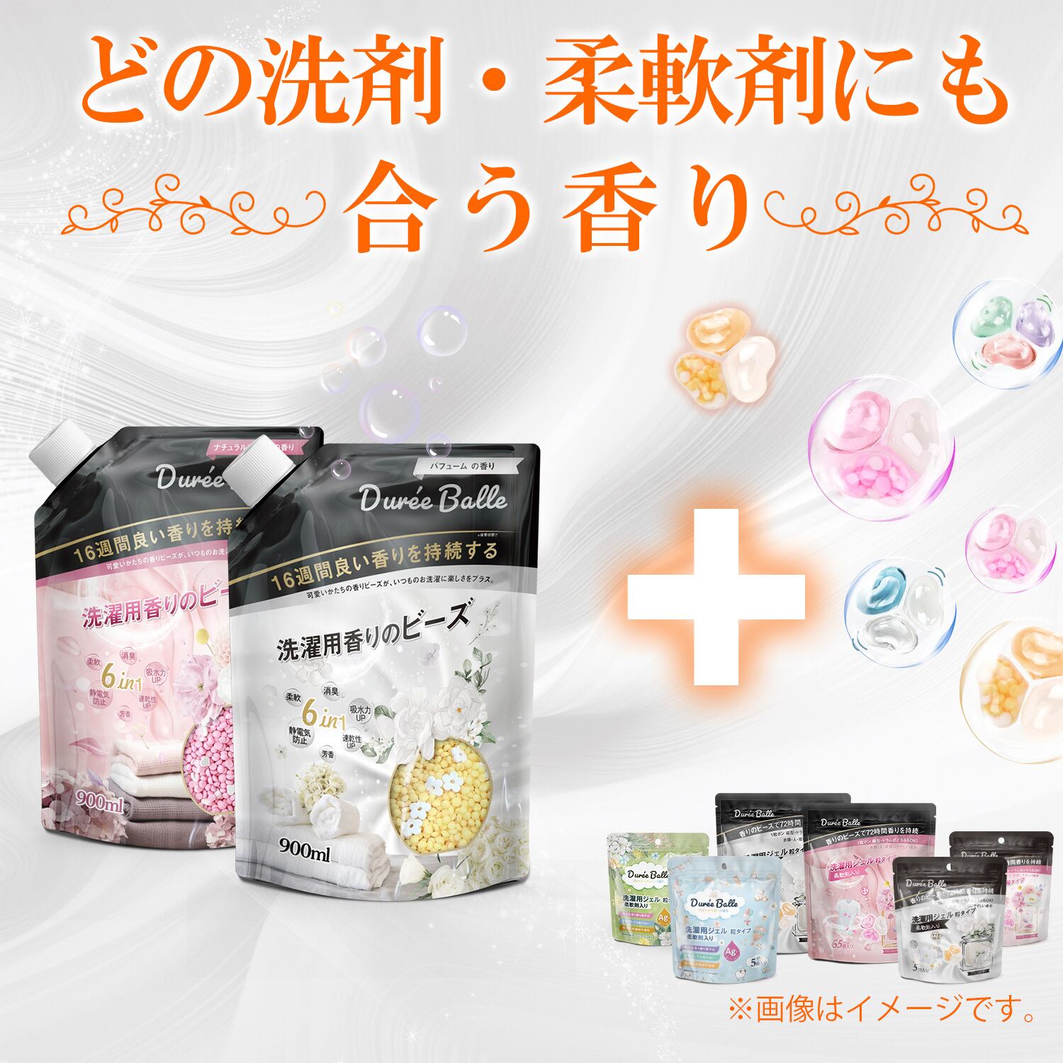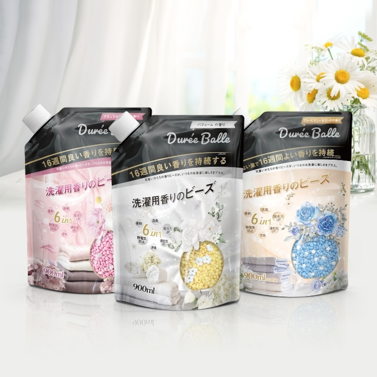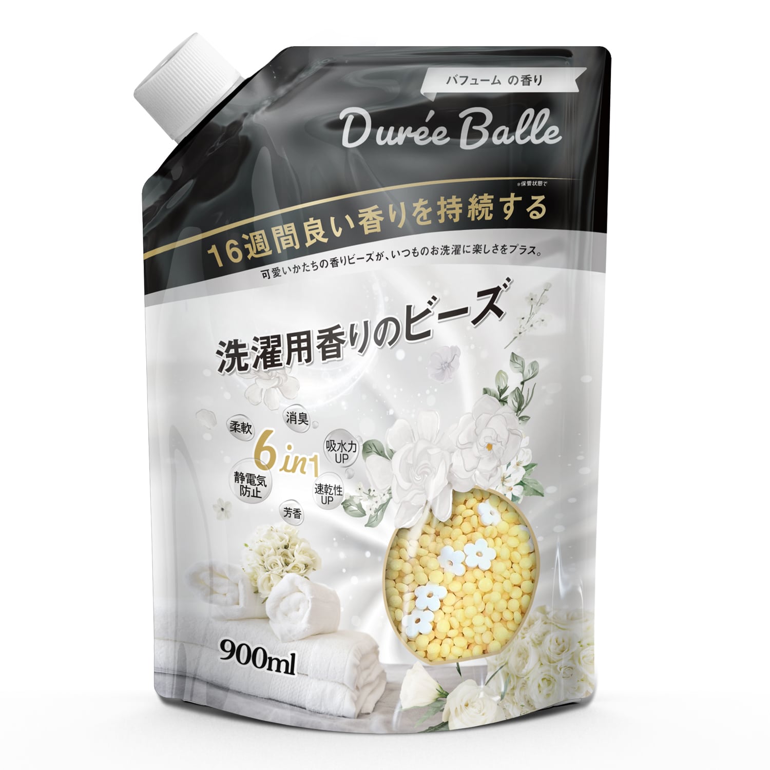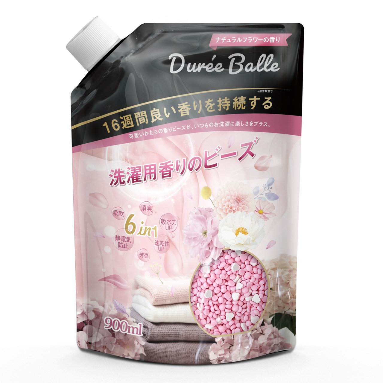 デュリボール香り付け専用ビーズは、洗濯物に高級感あふれる香りをプラスするためのフレグランスビーズです。たっぷり900mlの大容量パウチで、使用量を自由に調節でき、お好みの香りの強さでお楽しみいただけます。