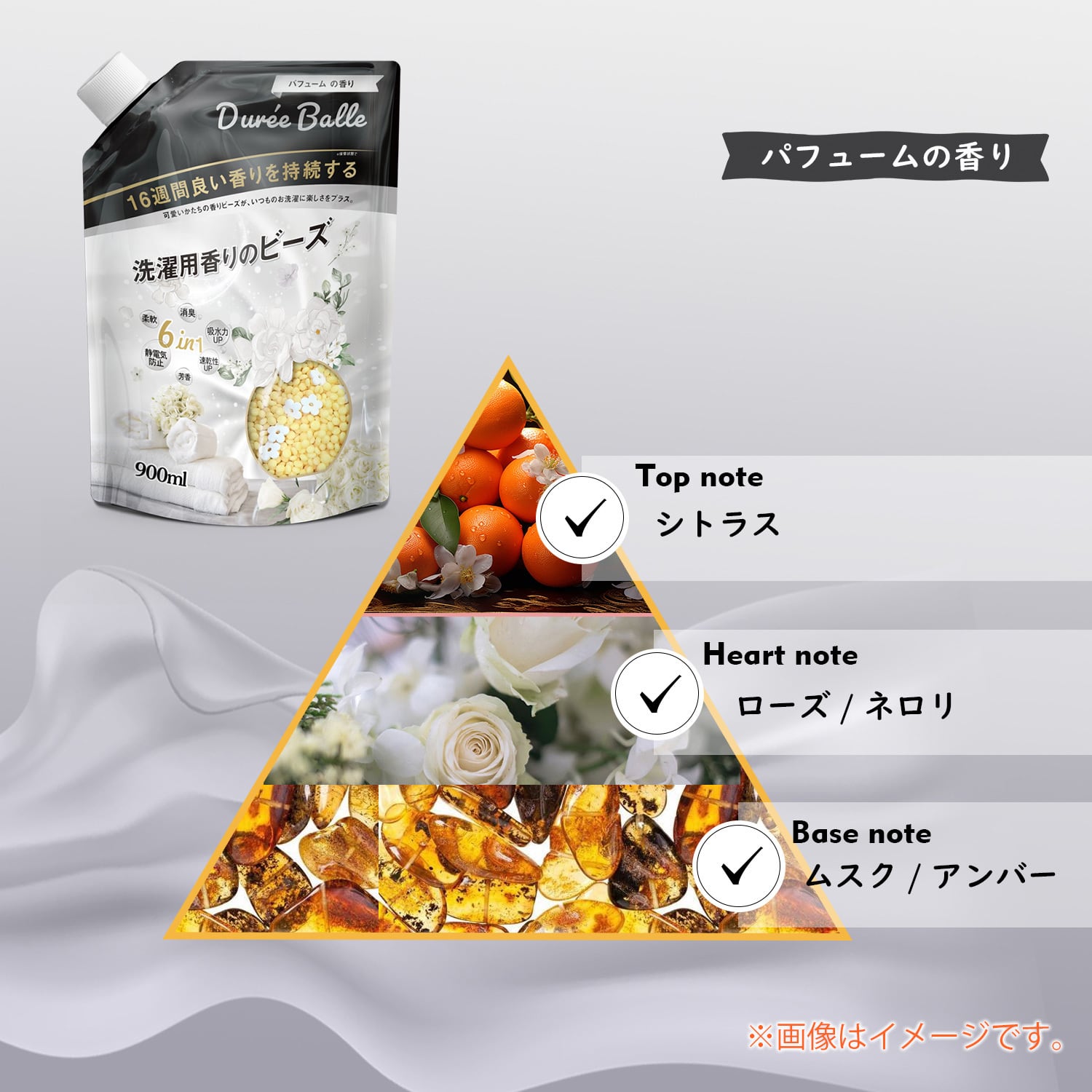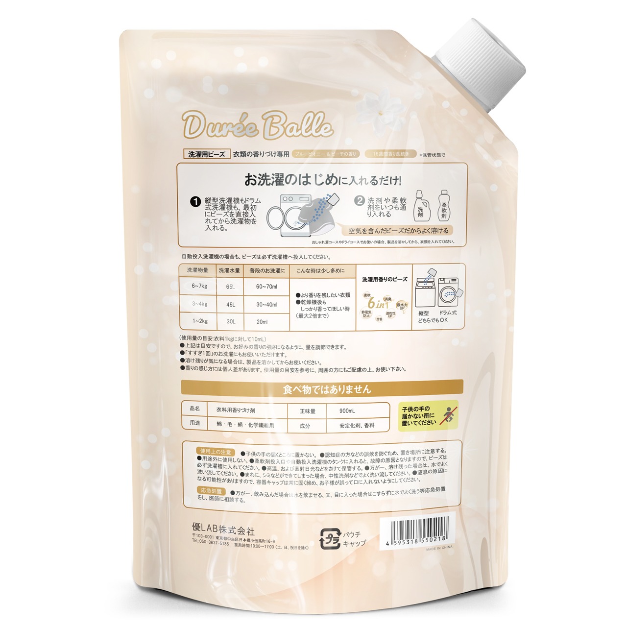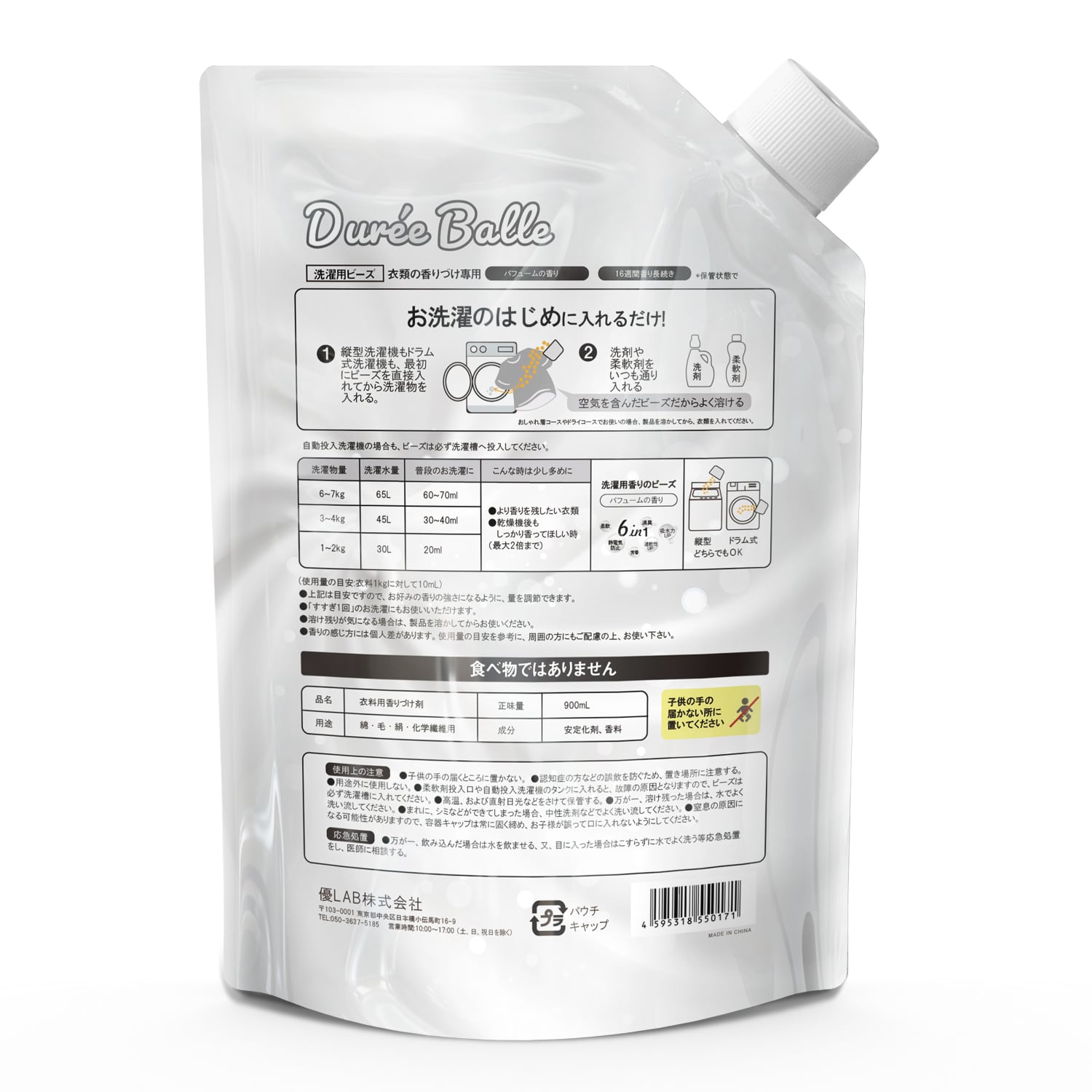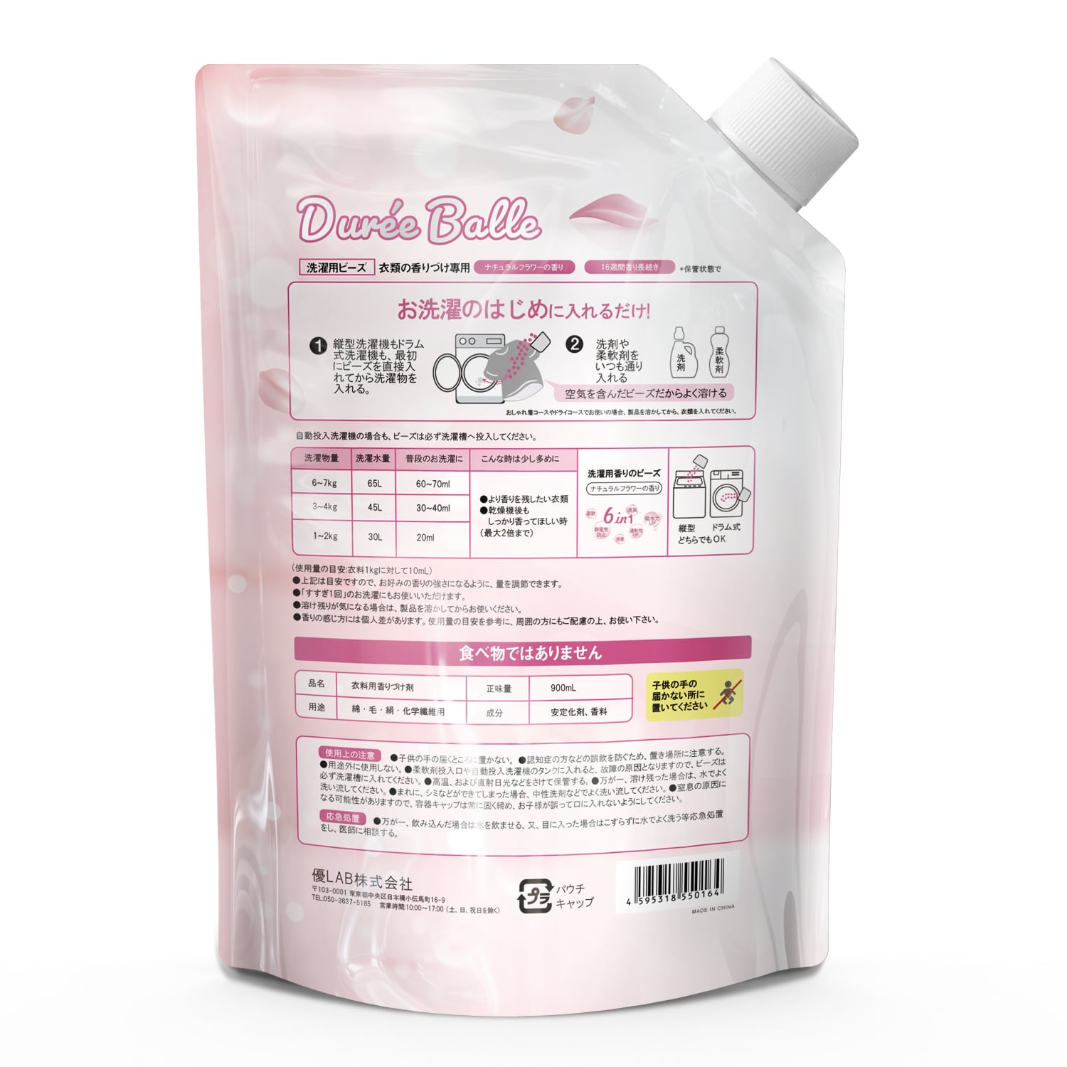 デュリボール香り付け専用ビーズは、洗濯物に高級感あふれる香りをプラスするためのフレグランスビーズです。たっぷり900mlの大容量パウチで、使用量を自由に調節でき、お好みの香りの強さでお楽しみいただけます。