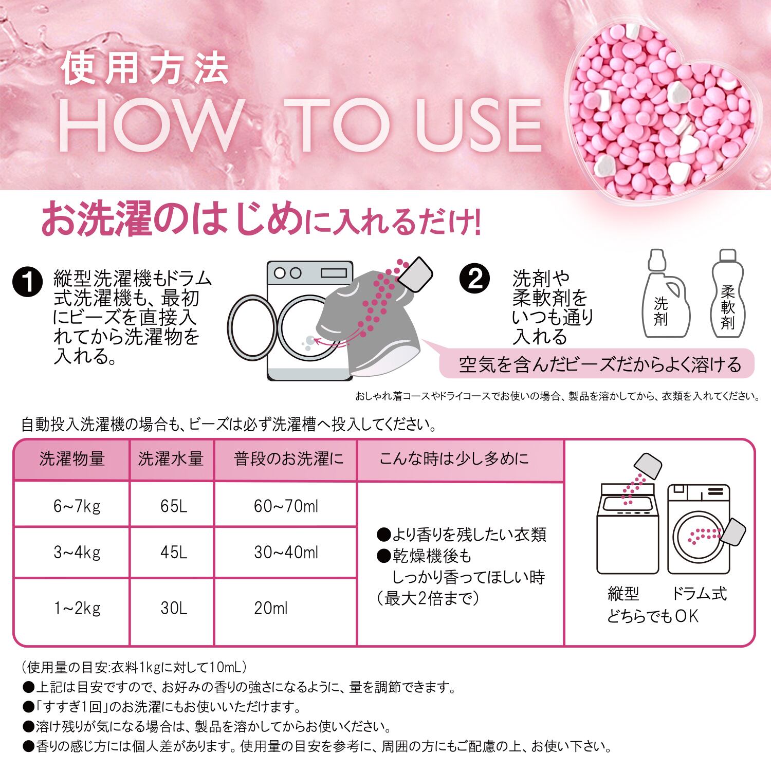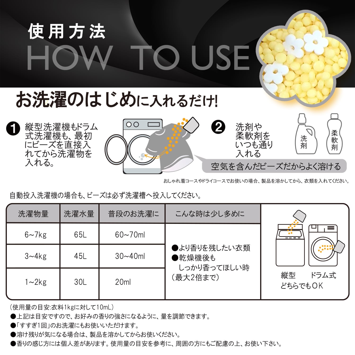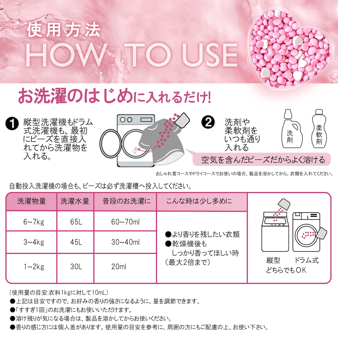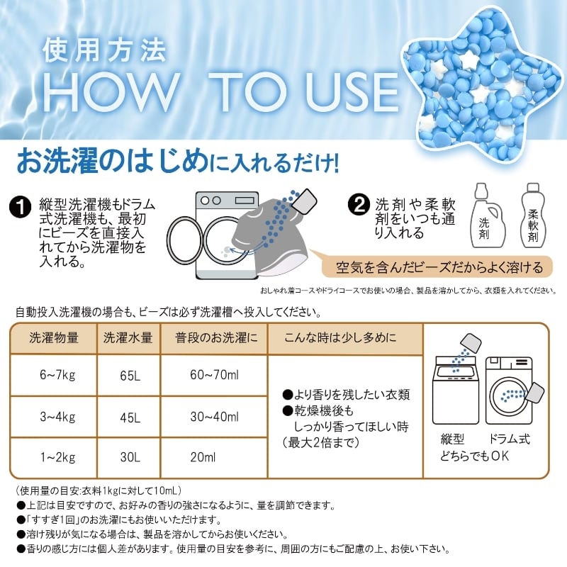 この香り専用ビーズは、洗剤や柔軟剤と一緒に洗濯機へ入れるだけで、最長16週間香りが持続します(※香りの持続期間は、衣類の素材、着用頻度、天候、湿度・温度などの保管環境によって変動します)。