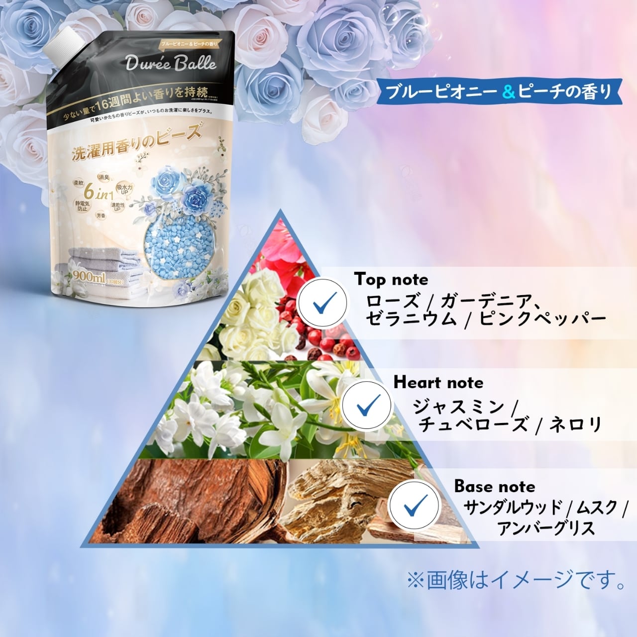 ブルーピオニー&ピーチの香りは、ブルーローズとジャスミンの上品な香りが広がり、特別な香りと柔らかさをプラスします。