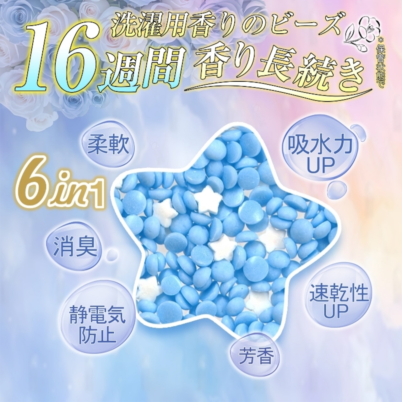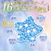 さらに、柔軟効果・消臭・静電気防止・吸水力アップ・速乾性アップ・芳香の、6つの機能を1つにまとめた洗濯用フレグランスです。
