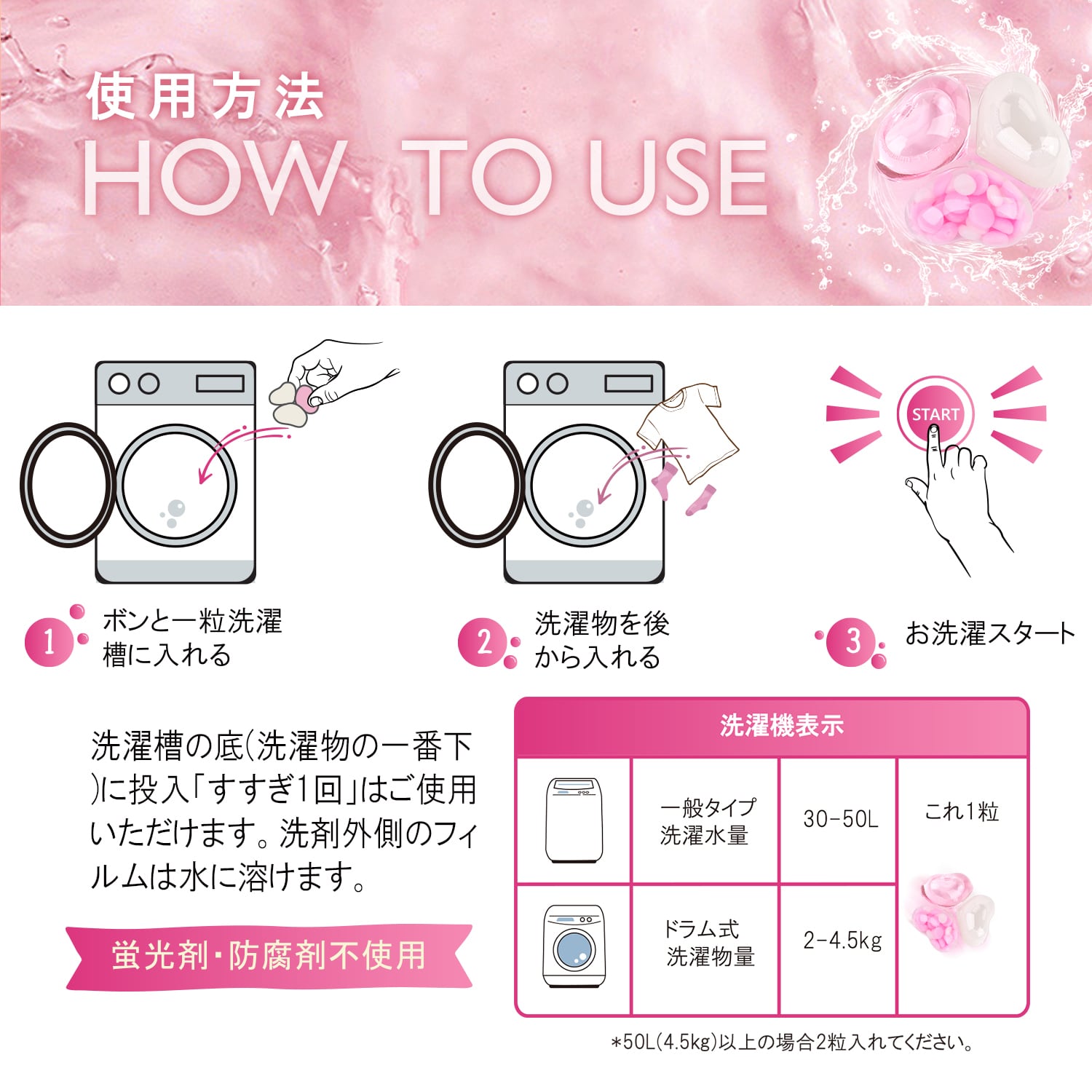 使い方は簡単です。1粒を洗濯機にポンと入れるだけ。