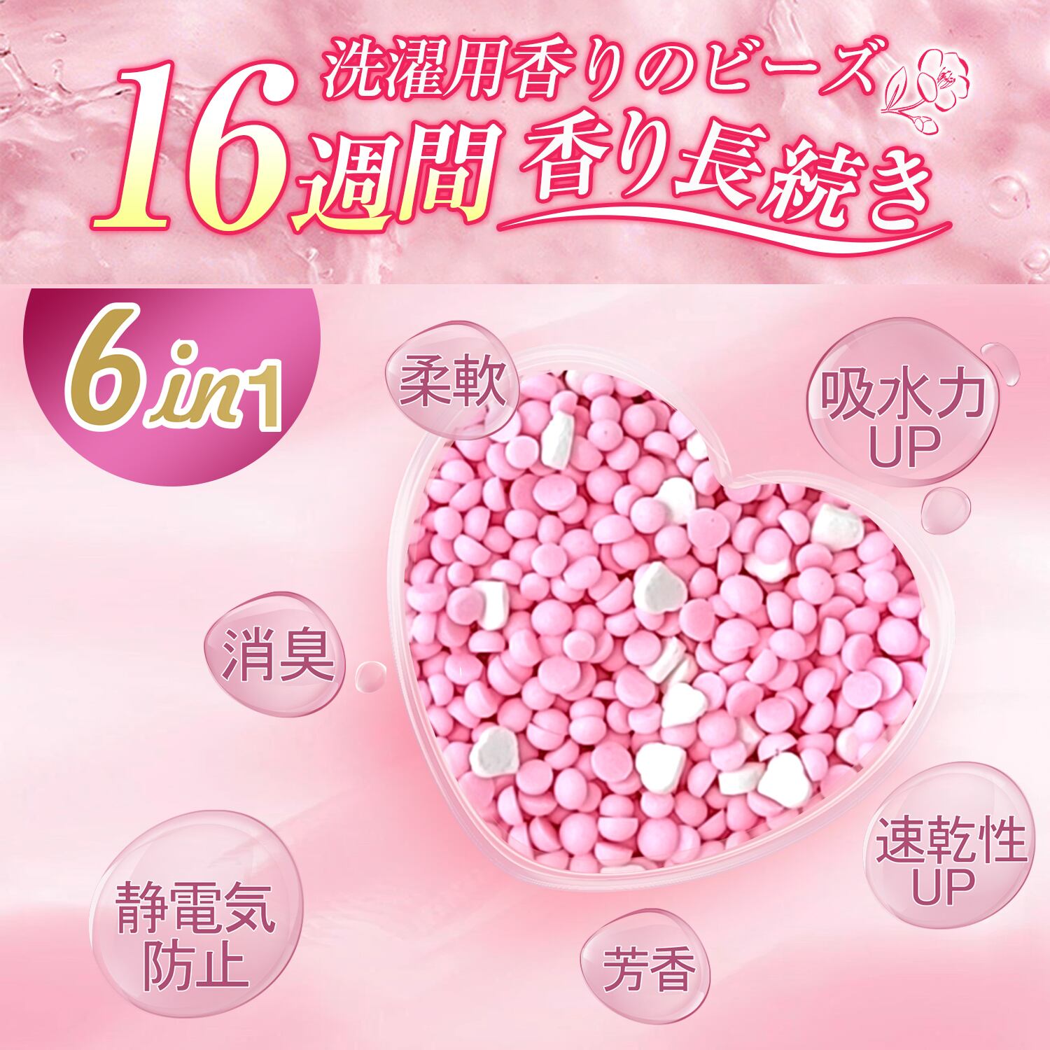 さらに、柔軟効果・消臭・静電気防止・吸水力アップ・速乾性アップ・芳香の、6つの機能を1つにまとめた洗濯用フレグランスです。