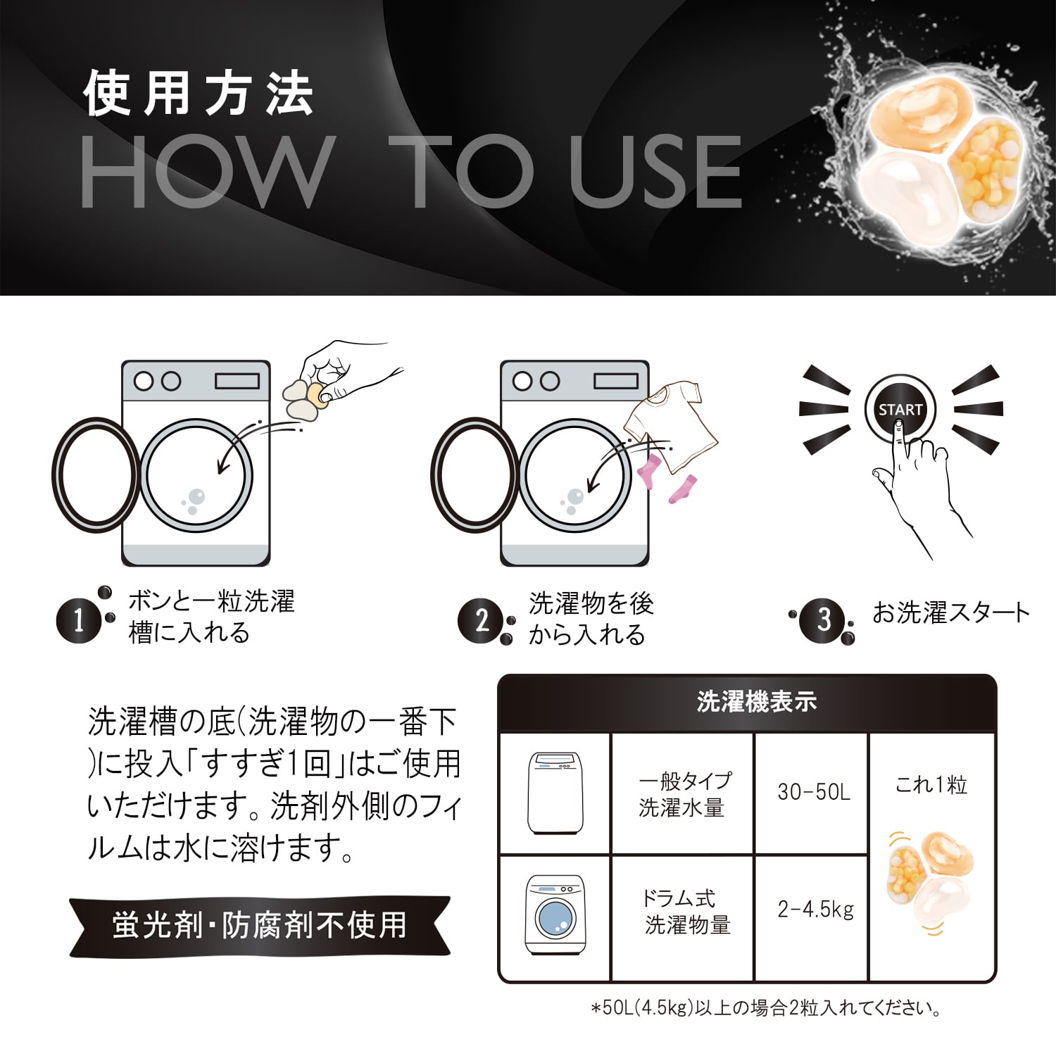 使い方は簡単です。1粒を洗濯機にポンと入れるだけ。